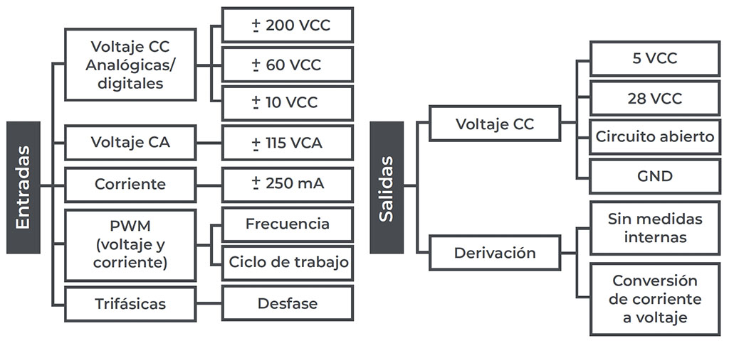 - Modos de entrada (selección por software): Diferencial, referenciada y no referenciada bipolar, corriente, PWM y trifásica